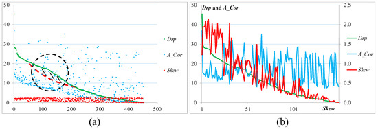 Values of the disruptiveness index of the selected intelligent robotic technologies: (a) the Drpk values of the total of 452 technologies are plotted in descending orders, with the corresponding A_Comk and I/T_Comk values; (b) line chart of the A_Comk and I/T_Comk values according to the descending order of the corresponding Comk values of the top 150 technologies with the highest Sig_Google values. Notably, some degrees of distortion from a proper power-law distribution are found in the curve of the Drpk values, and they are marked in a circle of black dot lines.