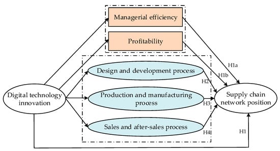 The framework of digital technological innovations affecting supply chain position is visually represented by two colors: blue indicates a direct relationship, while orange indicates an indirect relationship. H1 and H4 represent six hypotheses, respectively, and the relationships among the hypotheses in this paper are shown in Figure 2 below.