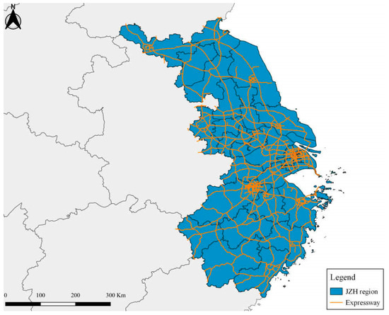 The Jiang–Zhe–Hu (JZH) region is located in eastern coastal China, covering a total area of 219 thousand square kilometers. It is one of the most active, open, and innovative regions in China in terms of the demographic, economic, and technological development. In 2021, the resident population reached 175.3 million, and the total annual GDP attained CNY 23,309.5 billion. Meanwhile, the expressway system of the JZH region is extensively developed, and its total length amounted to 11,074 km as of 2021 [40]. The expressway network of the JZH region is depicted in Figure 1.