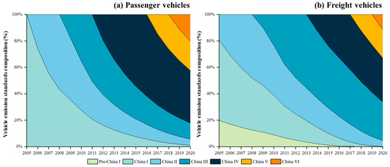 where is the vehicle population of vehicle type with age at the year of . is the number of newly registered vehicles for vehicle type in year , which is from the statistical yearbooks of the JZH region. is the survival rate for vehicle type with age . denotes vehicle population of vehicle type at the year of . As an indicator of vehicle age distribution, denotes the percentage of vehicles with age for vehicle type in year. is a binary parameter which equals 1 if the newly registered vehicles obey emission standard in year , and 0 otherwise. Meanwhile, always holds. On this basis, the compositions of VP with various emission standards for passenger vehicles and freight vehicles, respectively, from 2005 to 2020, are displayed in Figure 2.