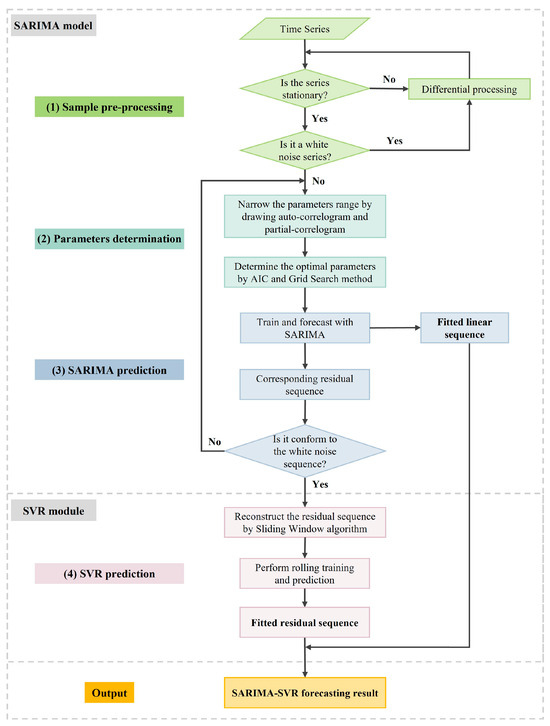 By summing the fitted linear sequence obtained from the SARIMA model, and the residual fitted sequence obtained from the SVR module, the prediction results of the integrated SARIMA-SVR model are derived, as illustrated in Equation (9):