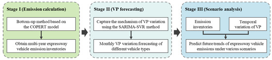 In this study, the research framework subsumes three stages, as shown in Figure 4. The first stage is to obtain the multi-year expressway vehicle emission inventories of the JZH region using the COPERT model. The second stage is to forecast the monthly VP variation of different vehicle types by the integrated SARIMA-SVR method. In the third stage, the possible future evolution trends of expressway vehicle emissions are predicted through scenario analysis. Then, expressway vehicle emission reduction policies in the JZH region can be formulated based upon the analysis results.