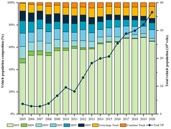 The continuous economic development and urbanization in the past two decades have stimulated the prosperity of China’s auto industry, and vehicle population (VP) in China has reached 417 million in 2022 [1]. Traffic-related emissions have grown to be one of the main anthropogenic contributors to atmospheric pollution that simultaneously influence air quality and human health [2,3]. For example, the vehicle emissions of nitrogen oxides (NOx) and volatile organic compounds (VOCs) are recognized as significant precursors of photochemical smog by production photochemical oxidizing substances (e.g., ozone), whilst particulate matter (PM) and carbon monoxide (CO) emitted from vehicles may enter and damage lung and bronchus, causing long-term health effects [4]. Accordingly, four pollutants from the transportation sector account for 35.0%, 16.8%, 6.6%, and 18.5% of the total NOx, VOCs, PM, and CO emissions, respectively, in China in 2017 [5]. Considering the rapid growth of VP and associated negative implications, various vehicle emission control policies (e.g., updating vehicle emission standards) have been developed successively in China. Yet, these policies have long-term impacts on vehicle emissions. Therefore, it is of great necessity to establish multi-year vehicle emission inventories, and analyze the vehicle emission trends and characteristics from a long-term perspective.