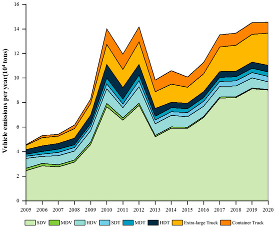 For CO, as Figure 7a presents, the emission first peaks at roughly 47.2 thousand tons per year in 2010, then peaks again in 2017 after fluctuating and descending, until it eventually stabilizes at about 48 thousand tons per year. Among the eight vehicle types, SDV contributes 59.9% of the total CO emissions, emitting a total of 375 thousand tons from 2005 to 2020. Despite the fact that SDV has lower EF and lower individual vehicle emission compared to freight vehicles, the significant VP and higher VP growth rate have made it consistently contribute the most to CO emissions in the investigated 15 years. However, in terms of the extra-large trucks and container trucks, due to their rapid increase in VP, coupled with the fuel type of diesel and higher emissions per vehicle, their contribution to CO emissions has elevated, particularly in recent years.