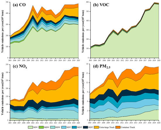Emission compositions of eight vehicle types in the JZH region between 2005 and 2020: (a) CO; (b) VOC; (c) NOx; and (d) PM2.5.