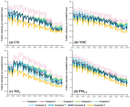 For NOx, as Figure 8c shows, the emissions rise further, peaks in 2023, and then goes downward in the baseline scenario mode. In the baseline Scenario 1, NOx emission reaches a peak of 3.5 thousand tons per month in February 2023, and eventually decreases to 2.2 thousand tons per month by December 2030. Nevertheless, under the most stringent policy Scenario 9, the peak emission occurs earlier in February 2022 at 2.5 thousand tons per month, and gradually decreases to 1.6 thousand tons per month by December 2030. The peak and valley values in Scenario 9 present reductions of 28.4% and 27.3%, respectively, compared to the baseline Scenario 1. It can be attributed to the main contributing vehicle types of NOx emissions, namely HDT, MDT, extra-large trucks, and container trucks. Compared to passenger vehicles such as SDV, these freight vehicles have relatively shorter lifespans in general. Consequently, outdated and high-emission freight vehicles experience a sharp decline in VP under external policy regulations, leading to the significant emission reduction effectiveness and an early peak.