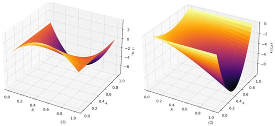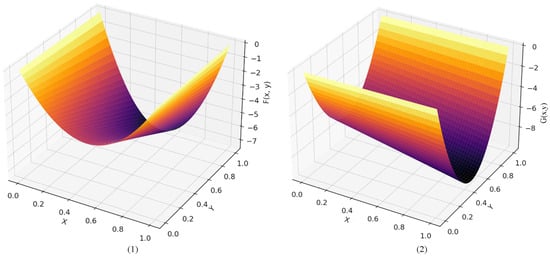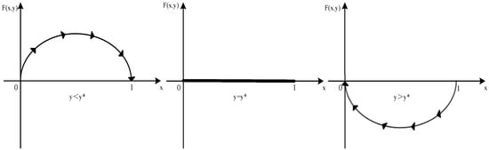 When p = 0.6, the numerical change in the dynamic evolution of enterprise is shown in Figure 10 (1), where F(x,2/3) = 0 is the critical point. When y < 2/3, the image is a convex function (), indicating that x = 1 is a stable point, at which time enterprises will choose high coping ability investment. When y > 2/3, the image is a concave function (), indicating that x = 0 is the stable point, at which time the enterprise will choose low coping capacity investment.