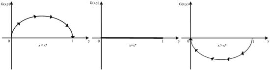 The numerical change in the dynamic evolution of governance is shown in Figure 10 (2), where G(13/33,y) = 0 is the critical point in the figure. When x < 13/33, the image is a convex function (), indicating that y = 1 is a stable point, and the government will choose to take the active disposal. When x > 13/33, the image is a concave function (), indicating that y = 0 is the stable point, at which time the government will choose the delayed disposal.