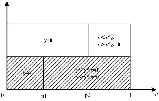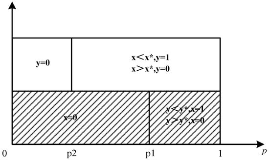 According to the strategy selection of enterprises and emergency management departments to deal with Natech, the probability p of Natech occurrence is divided into two points of and and three segments (0, 1). In this study, the loss caused by the occurrence of Natech is fixed, so P1 and P2 can be used as the threshold of the Natech risk level. To analyze the evolutionary stability of government and enterprise under different Natech risks, three risk levels are represented on the Natech occurrence probability axis, the respective stable evolution strategies of enterprises and emergency management departments are marked, and the ESSs of government and enterprise under different Natech risk levels are obtained. The shaded part in the figure is the evolutionary strategies of enterprises.