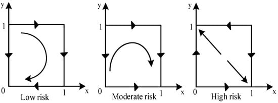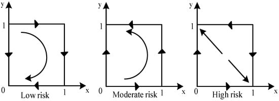 Obviously, there is also a special scenario of , in which there is no moderate risk. In this case, the evolutionary dynamics graph of government and enterprise only includes low Natech risk and high Natech risk. The dynamic nature of evolution is the same as in the above two situations, so we will not delve into details here.