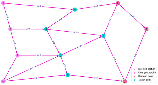 Constraint Formula (4) indicates that the transport volumes of emergency materials between each pair of emergency points and demand points should comply with the transport capacity limits of the emergency transportation network.