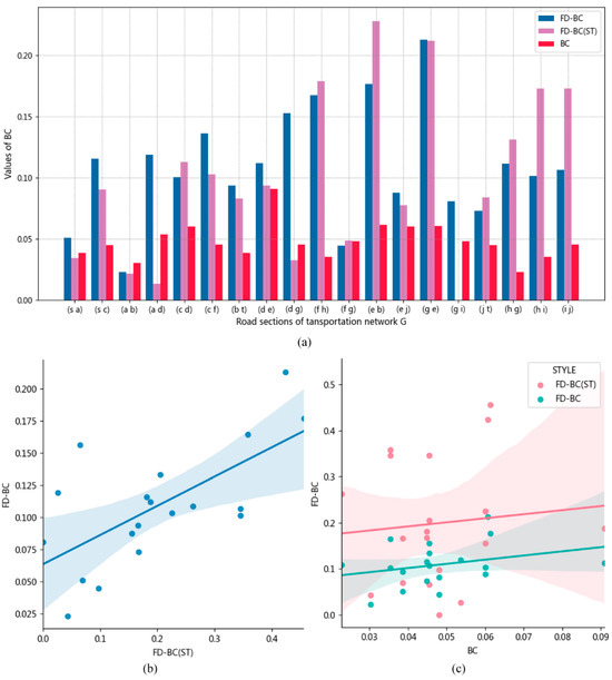 Parameter a is the adjustment coefficient: a = 1 when the transportation network is a directed network, while a = 2 when the transportation network is an undirected network. N represents the number of edges in the network. FD-BC represents the expected value of the ratio of transport volume carried by the target road section to transportation network capacity under all possible combinations of the origin and destination points. The higher the value of FD-BC, the more crucial the road section is within the transportation network. The comparison between FD-BC and the existing complex network indicators is shown in Table 1.
