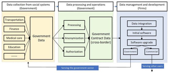 In summary, the existing literature focuses primarily on how data points operate within individual sectors and lacks analysis of data exchange between the public and private sectors. Research on the practical use of government data is similarly limited []. We aim to analyze how government data can transform business innovation models. In Section 2.2, we explore how government data points enter the private sector, addressing the gap in the government data ecosystem literature regarding cross-border data flow []. Additionally, we examine how firms leverage government data for business innovation and how this process is realized. The literature currently lacks an exploration of government data exploitation in the context of private sector data development as well as an in-depth analysis of how government data points facilitate knowledge creation within firms [,].