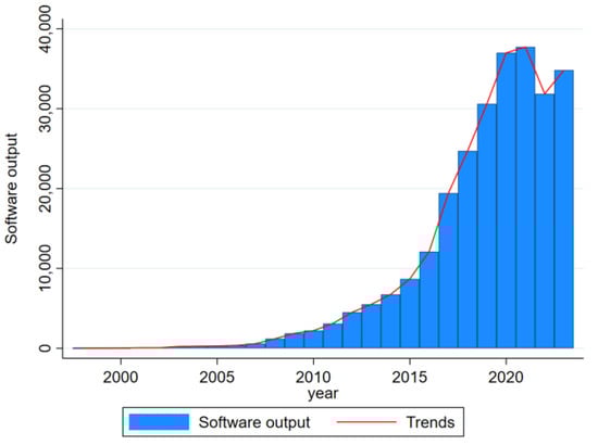 Immediately following this, we judged whether these firms have technological innovation activities, measured by whether they have software output. Software is a trained algorithmic logic that requires data for testing and development, so software innovation needs data to support it. We define “software output” as the innovative outcomes generated by firms through the use of big data. This metric effectively measures the performance of data utilization in driving business innovation. By matching companies with data contracts and software outputs, we formed a database covering data input and software output. After excluding companies with no software output, we obtained detailed information on 278,315 software outputs from 1815 high-tech companies. Observing the impact of access to data contracts on firms’ innovation output helped us test the research hypotheses in Section 2.2.