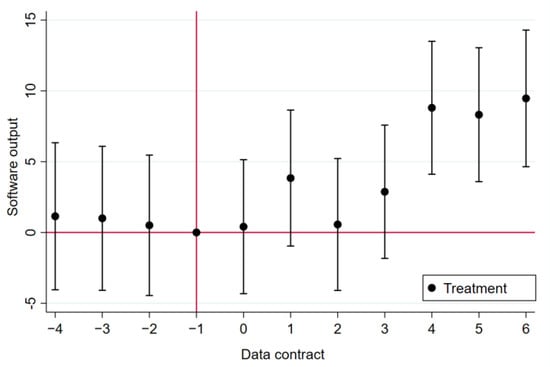 We used a variant of the parallel trend assumption in staggered DiD, where the parallel trend assumption is satisfied only after some treatments have commenced []. Specifically, we categorized firms that initially acquire contracts with relatively few data points, followed by contracts with relatively more data, as the treatment group, while firms that only acquire contracts with relatively few data points serve as the control group []. This approach has several advantages: it avoids the strong assumptions of traditional parallel trends. Since contracts are not signed simultaneously, finding an ideal control group to impose a parallel trend at any given point in time is challenging. One possible scenario is that a certain percentage of firms develop the ability to access data support over time. Consequently, the criteria for judging whether a firm accesses data support can create a heterogeneous control group, potentially violating the parallel trend assumption. This setup improves estimation efficacy by eliminating some potential factors that influence whether a firm has access to data support.