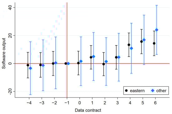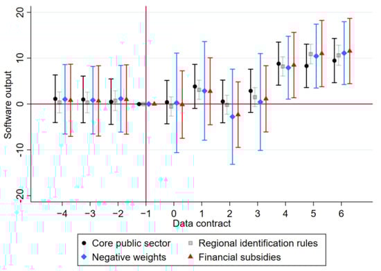 Regression analyses using staggered DiD often face the problem of “negative weighting” []. It is challenging in staggered DiD models to assume that treatment effects are homogeneous across time or individuals, and ensuring consistency in these effects is difficult. One potential issue arises when firms that receive substantial data inputs early in the sample period become part of the control group for firms receiving these contracts later on. This situation can lead to negative weighting of early treatment effects, causing cross-period contamination that may negatively influence estimated coefficients in the middle or late parts of the sample. In essence, assuming homogeneity in the average treatment effect across all periods after firms receive substantial data inputs is problematic, especially among firms initially receiving small data inputs.