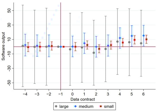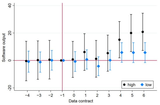 Figure 7 shows the corresponding regression results. The black dots represent the regression results for the high-level group, and the blue diamonds represent the regression results for the low-level group. We found a significant difference between the two groups. The positive impact of substantial data inputs on firms’ product innovation is significantly higher in the high innovation capability group than in the low innovation capability group after four years. Thus, firms accumulate valuable experience from utilizing data for software development, and this accumulated experience significantly enhances firms’ product innovation performance.