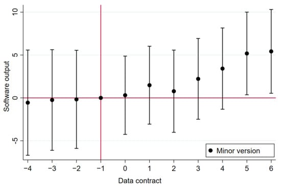 We conducted regression analyses after modifying the corresponding dependent variable to a minor version of the software output. Other settings are consistent with the baseline regression model. Figure 8 shows the regression results based on product innovation in minor version software. The results present a significantly positive average treatment effect, indicating that substantial data inputs significantly contribute to product innovation in firms’ minor version software after two and a half years. This supports the notion that large data inputs help firms continually enhance their product innovation quality through iterative upgrades. Up to this point in our analysis, we confirmed the validity of Hypothesis 2.