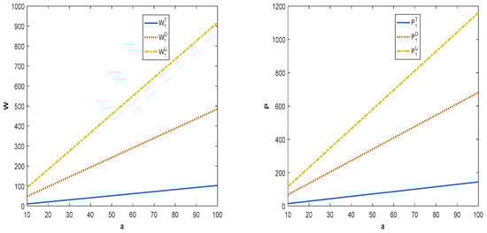 Referring to the settings of Li et al. [], let the production cost of unit product be zero. Like the existing marketing literature [,] and [], we set the cost of quality investment to be . This is consistent with the fact that companies often need to invest more money to improve the quality of their products.