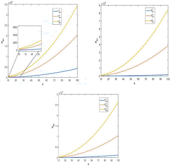 Proposition 1 gives the optimal wholesale price and the optimal retail price of the product in the model where the manufacturer does not invest in quality. From Proposition 1, we can see that both the optimal wholesale price and the optimal retail price monotonically increase with . This is due to the increase in the potential demand for the product, which brings more consumers. Therefore, supply chain participants will appropriately increase the product price to obtain more profits. Substituting , and into Equations (1)–(3), the manufacturer’s profit, retailer’s profit and product demand can be obtained as follows: