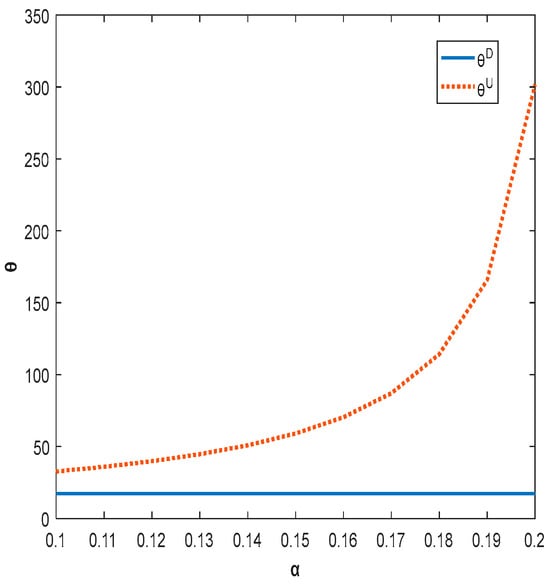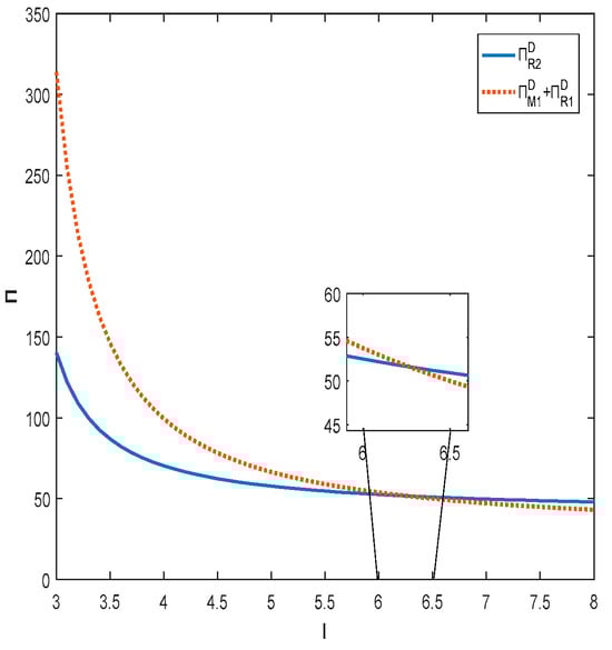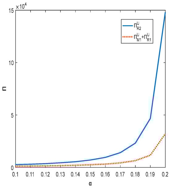 , the increase in the manufacturer’s profit is not less than the increase in the profit of its downstream retailer, i.e., . Conversely, when , the retailer’s profit increase is higher than that of its upstream manufacturer, i.e., , where .
