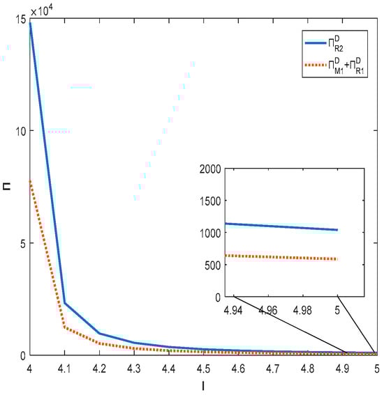 The difference between the total profit of the centralized supply chain and the total profit of the decentralized supply chain can be simplified to obtain the following expression: . Both A and B are positive, as determined by . Thus, the difference in total profits is closely related to the open upward quadratic equation . Whether the difference in total profits is positive or negative correlates with the function value of . Further analysis results in the following discriminant equation: . When , the function value of the function is constantly positive, which means . When , the function value of the function is constantly 0, which means . When , the function value of the function is always negative, which means . Further, when , we obtain . The function value of the quadratic equation is always positive in the domain , i.e., . When , we obtain . The value of a function of the quadratic equation is always non-negative in the field . The point where the function value of is 0 is . Comparative analysis shows that . Therefore, the quadratic equation f(l) is constantly positive in the domain of definition , i.e.,. In summary, when , we obtain .