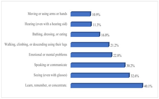 Currently, the number of people with disabilities is constantly increasing. According to the World Health Organization, approximately 15% of the global population has some form of disability, amounting to 190 million people requiring some type of assistance service []. In Mexico, 7,168,178 people have disabilities along with some neurological conditions, representing 5.69% of the total population. Of this group, 2% are children. Figure 1 shows that 40.1% of the child population in Mexico suffers from mental illnesses and cognitive capacity problems. However, currently, there are no precise data available for the number of children with any neurodivergent condition [].