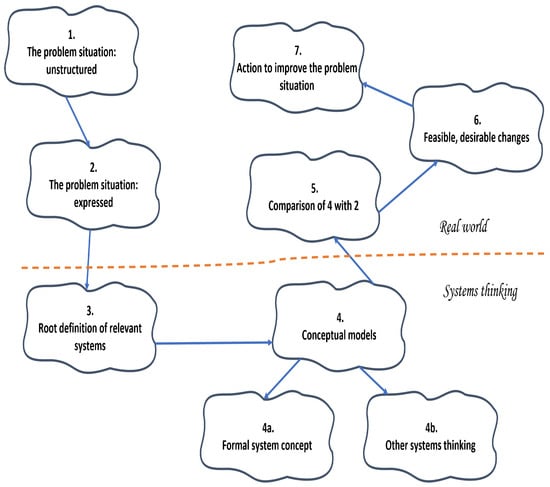The Soft Systems Methodology (SSM) emerges as a response to the unsuccessful application of the hard systems methodology in complex real-world situations [,,]. SSM seeks to address situations where people involved in a problem perceive and interpret the world uniquely and make decisions based on standards and values that others may not share [,]. This approach prioritizes flexibility, adaptability, and continuous learning []. To achieve this, SSM employs systemic ideas to formulate the following fundamental mental acts: perceive, select, predict, compare, and decide actions [].