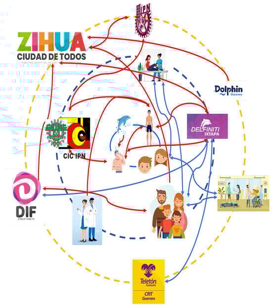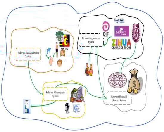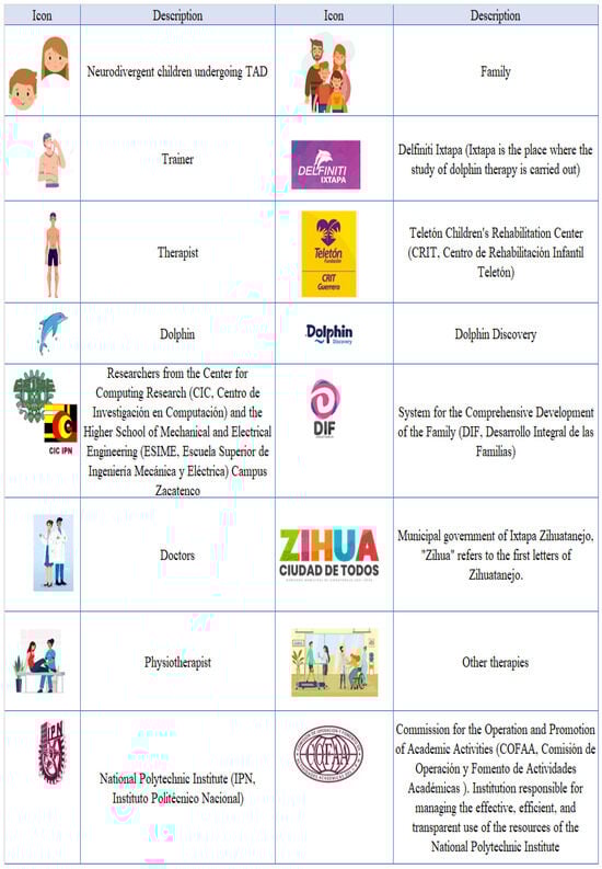Figure 4 illustrates the main subsystems that interact externally with the system. In the second level (blue halo) are the agents interested in the development and study of TAD, such as physiotherapists, Delfiniti staff, family members, doctors, and researchers from the Higher School of Mechanical and Electrical Engineering (ESIME, Escuela Superior de Ingeniería Mecánica y Eléctrica) Campus Zacatenco and the Research Center for Computing (CIC, Centro de Investigación en Computación). In the third level, we find the organizations, both public and private, that support the elements of the first level (yellow halo), including the National Polytechnic Institute (IPN, Instituto Politécnico Nacional), the municipal government, Dolphin Discovery, the Teletón Children’s Rehabilitation Center (CRIT, Centro de Rehabilitación Infantil Teletón), the Municipal System for the Integral Development of Families (DIF, Sistema Municipal de Desarrollo Integral de las Familias), and other therapies.