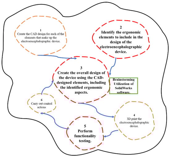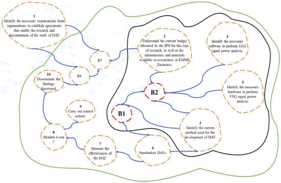 For the purposes of this manuscript, models B1 and B2 are shown below in Figure 9 and Figure 10, respectively. Model B1 outlines the process for standardizing the DATs; This model will be executed until a standard time is established for the activities developed in the DATs. On the other hand, Model B2 explains the processes for the development and redesign of the electroencephalographic device; This model will be performed as many times as is necessary until the device is functional, comfortable, and appealing to patients.