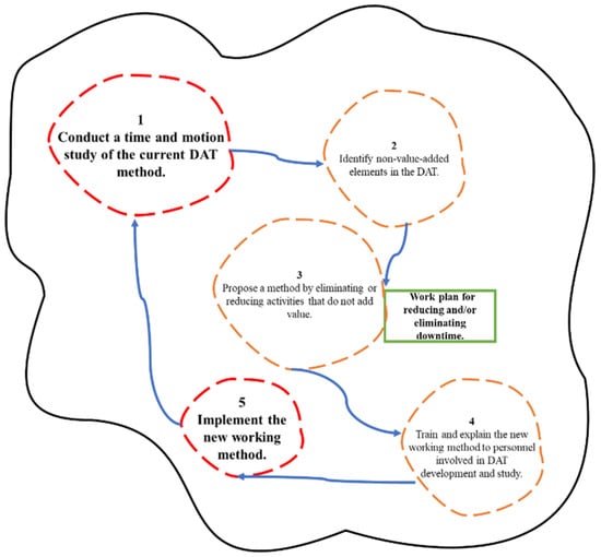Models B1 and B2 have a bidirectional relationship, as the diagnosis of the current DAT method leads to the redesign of the devices used; thus, the redesign of these models modifies the time study conducted, which provides a basis for a new diagnosis, creating a continual improvement cycle between these two models.
