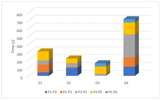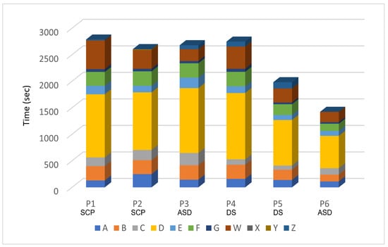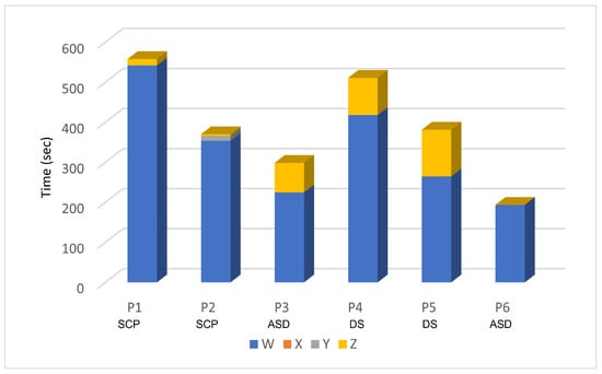 In Table 2, it is observed that during DAT monitoring, some activities that do not add value are recognized, such as waiting times derived from the trainer (W), therapist (X), dolphin (Z), or TGAM1 sensor repositioning (Y). Figure 12 presents the results obtained in this study. The time to place and remove the sensor (activities A and G) varies depending on the type of condition the infant undergoing the DAT has.