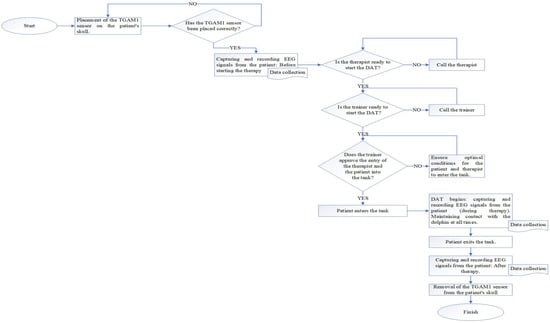 This manuscript represents a general framework applied specifically to DAT. Our findings are significant because they can serve as a reference point for standardizing other alternative therapies that lack an established framework. This could improve the consistency and reproducibility of the treatment, facilitate the comparison of results and effectiveness evaluations, and strengthen the credibility and acceptance of therapy among healthcare professionals and patients. In future work, our goal is to develop the ergonomic redesign of the electroencephalographic device, which is expected to reduce the downtime caused by its readjustment, impacting the reduction in the downtime caused by the trainer and therapist. This will enable the capture of EEG signals without interruptions before, during, and after DAT. Although the method has been described using BPMN, the simulation of this process remains pending for future work, with the aim of conducting a more detailed time study. Finally, the objective is to establish a standardized protocol for the DAT methodology and derive a benchmark time frame that enables the acquisition of more reliable samples. This will facilitate the precise measurement and evaluation of the efficacy of DAT specifically for the infant cohort under investigation.