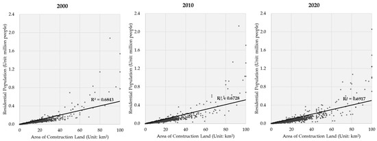 Furthermore, by comparing the six plots in Figure 11 and Figure 12, the following observations can be made: (1) The linear regression fitting of the employment population and construction land has a clear advantage in terms of the coefficient of determination, but the relative advantage is decreasing, as evidenced by the narrowing gap in R2 from 2000 to 2020. (2) The coordination between the residential population and construction land has improved, as indicated by the increase in the coefficient of determination from 0.6843 in 2000 to 0.6917 in 2020. (3) The coordination between the employment population and construction land has continuously decreased, reflected by a continuous decline in the coefficient of determination from 0.7731 in 2000 to 0.7266 in 2020.