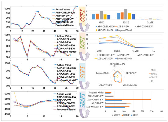 Comparison of the proposed model wit EW models ADP-ORELM-EW, ADP-BP-EW, ADP-GMDH-EW, and ADP-ANFIS-EW shows that the values are all positive, which indicates that the proposed model outperforms the other models with EW. Specifically, the values of the proposed model and ADP-GMDH-EW models for RMSE and TIC are as high as 0.869243 and 0.868656, respectively, on the SEAFI dataset. Therefore, the adaptive model selection module in the proposed model is more significant for the CFI. According to a comparison of the proposed model with models employing other intelligent optimization algorithms such as ADP-LASSO-MOGWO, ADP-LASSO-MODA, and ADP-LASSO-MOPSO, the values are all positive, which demonstrates that the performance of the proposed model surpasses that of the models using other intelligent optimization algorithms. The difference in the value between the proposed model and models using other intelligent optimization algorithms is relatively small for most indicators and datasets. However, the values of the proposed model and ADP-LASSO-MODA models on RMSE and TIC indicators are as high as 0.105147 and 0.105402, respectively, on the DCFI. Hence, the multi-objective ensemble module in the proposed model is more effective than other intelligent optimization algorithms for the CFI.