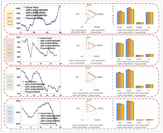 In the SEAFI dataset, the proposed model excels, with an MAE of 27.635876, an RMSE of 32.146729, and an MAPE of 0.545154%. In contrast, ADP-LASSO-MOGWO performed poorly, with MAE, RMSE, and MAPE values of 29.484178, 34.217756, and 0.583031%, respectively. ADP-LASSO-MODA showed the worst RMSE of 34.409024. For the DCFI dataset, the proposed model demonstrated strong performance, achieving an MAE of 5.122103, RMSE of 6.506787, and MAPE of 0.572040%. Conversely, ADP-LASSO-MODA underperformed, with corresponding values of 5.525988, 7.271350, and 0.612448%, while ADP-LASSO-MOGWO had the highest MAE and MAPE values of 5.568783 and 0.632117%, respectively. On the SCFI dataset, the proposed model again shows superior results, with an MAE of 4.469254, RMSE of 5.254923, and MAPE of 0.536753%. Meanwhile, ADP-LASSO-MODA lags behind, recording corresponding values of 4.868545, 5.737525, and 0.588101%. Finally, on the CCFI dataset, the proposed model achieved outstanding performance, with an MAE of 0.995431, RMSE of 1.278544, and MAPE of 0.114937%. Conversely, ADP-LASSO-MODA yielded less favorable results, with corresponding values of 1.142011, 1.440428, and 0.131289%.