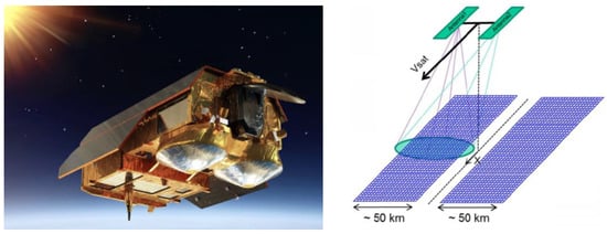 The application of MBSE was studied on the S3NGT mission. The goal of S3NGT is to ensure the continuity of the current Copernicus Sentinel-3 nadir altimeter measurements from 2030 to 2050. Since the current Sentinel-3 constellation temporal and spatial sampling capabilities are insufficient, improving global-scale altimeter sampling is a key objective. Therefore, S3NGT consists of a constellation of two large satellites, flying in formation in a sun-synchronous dawn–dusk (LTAN 6pm) orbit. The payloads include a ka-band across-track interferometer with a low-resolution mode for the open ocean and land ice and a high-resolution mode for the ocean and hydro ice. Additionally, a MWR (microwave radiometer) is foreseen. The constellation can achieve global five-day revisit with an effective ocean spatial resolution of 50 km. The payload measurement geometry is depicted in Figure 1 [].