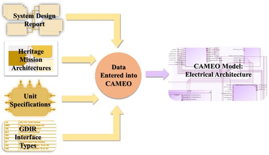 Process of compiling relevant electrical documents into CAMEO electrical architecture model. Each type of document shown in brown contains information that is needed to create the electrical architecture. In the modeling process, this information is eventually contained within the CAMEO model.