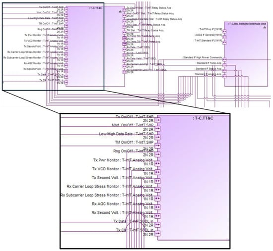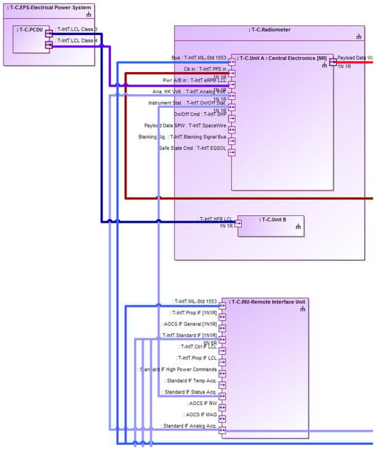 The Telemetry and Telecommand (TMTC) units, comprised of the Payload Downlink unit and the TT and C unit were also separated into their own IBD (Figure 3). To validate the interfaces associated with the microwave radiometer, an additional architecture diagram was created. To do this, the radiometer design report was used as the information source. Within this IBD (Figure 4), it could be seen how the payload data flow through the satellite, and how the connected units interact with the radiometer. In this way, interfaces could be traced to ensure that the platform units will collect and distribute payload data as expected and have an overview of the payload integration into the platform. Approximately 1520 interfaces including redundancy and multiplicity were defined at this early phase.