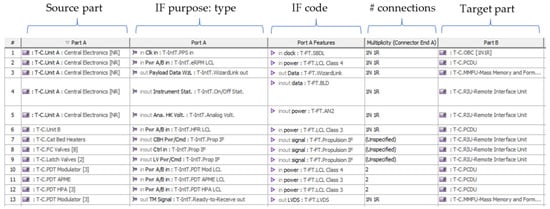 From this architectural model (Figure 3 and Figure 4), electrical interface control documents (EICDs) were automatically generated using a CAMEO Whitebox ICD Table (Figure 5). A heritage EICD document was referenced, and it was seen that normally, the information provided included the specific unit name, GDIR interface code, the connected unit, and a note on the purpose of the interface. Additional CAMEO capabilities for end-to-end interface control and tracking were also explored for applications on smaller satellite missions during architecture creation.