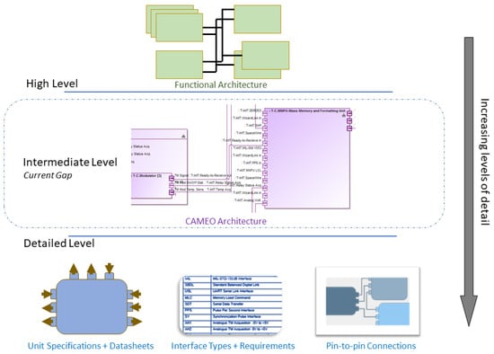 Current level of detail provided by the available electrical interface engineering documents. The gap between the high level and the detailed level is proposed to be filled by the CAMEO electrical architecture, which bridges this gap to provide an intermediate level of visualization into the design.
