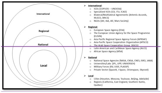 As previously stated, the multilevel governance framework is an analytical tool that enables the study of complex systems. Therefore, it is beneficial to apply this conceptual and theoretical method to the analysis of the space system with the aim of understanding the governance of space-related activities. This can be achieved by mapping the most relevant actors involved in space activities according to arenas or levels.