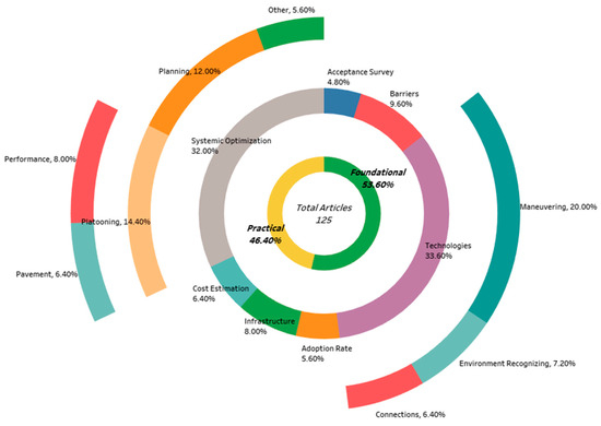 - Community Engagement: This subdivision aims to gather insights from the target community, which includes drivers, company owners, and policymakers. Changes in transportation significantly impact the supply chain. While some studies in the reviewed literature have devoted efforts to examining this facet, only 25 out of 67 articles on foundational aspects addressed these effects. In total, only 20% of the studies have focused on analyzing impacts, barriers, and adoption rates. As has been previously established, policymaking is as crucial as the technical aspects of new technology. Therefore, it is imperative to suggest more investigations into community engagement within foundational aspects. In this study, only 25 research papers could be classified under community engagement, with three categories created to differentiate them. However, critical gaps in the literature remain evident. Notably, there is a significant lack of research focused on policymaking to facilitate the implementation of this new technology. Although this gap can be considered a practical implementation issue, its foundational aspect is discussed here. The introduction of autonomous trucks is expected to cause substantial disruptions in the foundational aspects of the supply chain, raising serious questions.