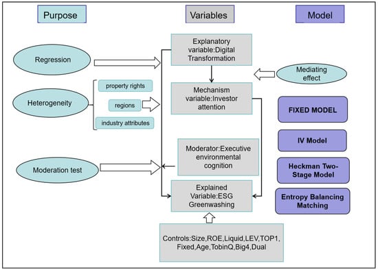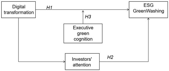 On the other hand, as far as information communication channels are concerned, digital transformation can enhance the interaction between enterprises and stakeholders by improving the transparency, accessibility, and openness of information (Li and Tian, 2024) []. The empirical results of Wang and Chen (2017) show that investors’ attention can alleviate the information asymmetry between enterprises and investors to a certain extent and it is also conducive to the flow of enterprise information among investors, which invisibly brings public pressure to enterprises, forcing enterprises to actively improve the level of information disclosure []. From the point of view of information mining, digital technology can help enterprises to empower the production, transmission, and management of internal information, strengthen the ability of enterprises to mine and integrate information, transform non-standardized information into standardized information, and make information more easily recognized by the outside world (Wu et al. 2021) []. Therefore, this lower information acquisition cost is also able to easily attract investors’ continuous attention. Investors’ attention is helpful in directly improving the degree and quality of information disclosure of enterprises and increase the cost of information disclosure manipulation (Raimo et al. 2021) []. Therefore, investors’ attention, as an informal system, governs the ESG greenwashing behavior of enterprises.