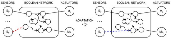Adaptation in noisy contexts is a typical scenario in nature. We recently explored an analogous case in simulation, where we let robots adapt to performing a simple task under the condition that some of their sensors needed for accomplishing the task were noisy or broken [23]. The experiment involved a robot controlled by a Boolean network [24,25,26] that has to learn to go towards the light (phototaxis behavior). The behavior of the robot is produced by the dynamics of the Boolean network, which updates the values of its nodes synchronously. Some nodes of the network, called “input nodes”, are connected to the light sensors, and some others (the “output nodes”) are connected to the motors controlling the wheels of the robot. If a light sensor is connected to a node of the network, the value of this node is set to 1 if the sensor reading is higher than a given threshold. The other nodes assume the values according to their Boolean update function. The value of the output nodes is used to move or halt the wheels (in our experiments, robots have two wheels).