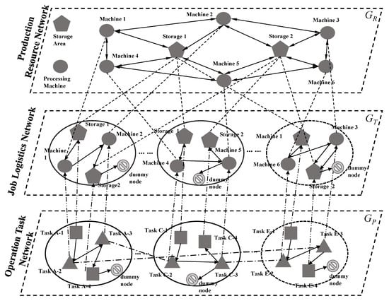 The specific description of each sub-network model is shown in Table 2. GR reflects the logical layout of machines and their buffer sites in a flow shop; GT reflects the material handling based on the operation tasks; and Gp reflects the relationships between machining tasks and transport tasks.