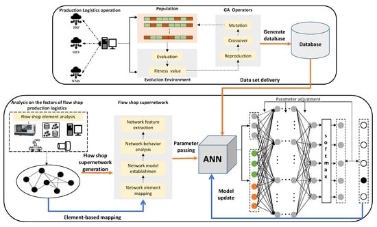 Motivated by the above background, this paper adopts the supernetwork theory to describe the production and logistics of digital-twin flow shops. As a result, machines, jobs, and buffer sites are mapped as nodes; and the inter/intra-layer process relationships between nodes are mapped as superedges, such as process sequence relationships and machine conflict relationships. Meanwhile, a dual back propagation (BP) neural network is used to establish a scheduling model aiming at improving solving efficiency. The main contributions of this paper are as follows: