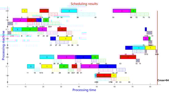 By using BP neural network 1 and BP neural network 2, the maximum completion time of the scheduling scheme is 84 according to the sequencing results of each operation task of the flow shop scheduling problem, with the consideration of the transport time. Scheduling Gantt charts can be generated based on scheduling sequences, as shown in Figure 3, in which the number represents the start and end time of operation tasks and logistics transport links. The logistics transport link includes the logistics tasks involving warehouses and production links. Among them, the gray squares crossed by dashed lines denote the logistics of the warehouse link; The squares filled with dashed lines denote the logistics of the production links. Operation tasks are represented by colored squares.