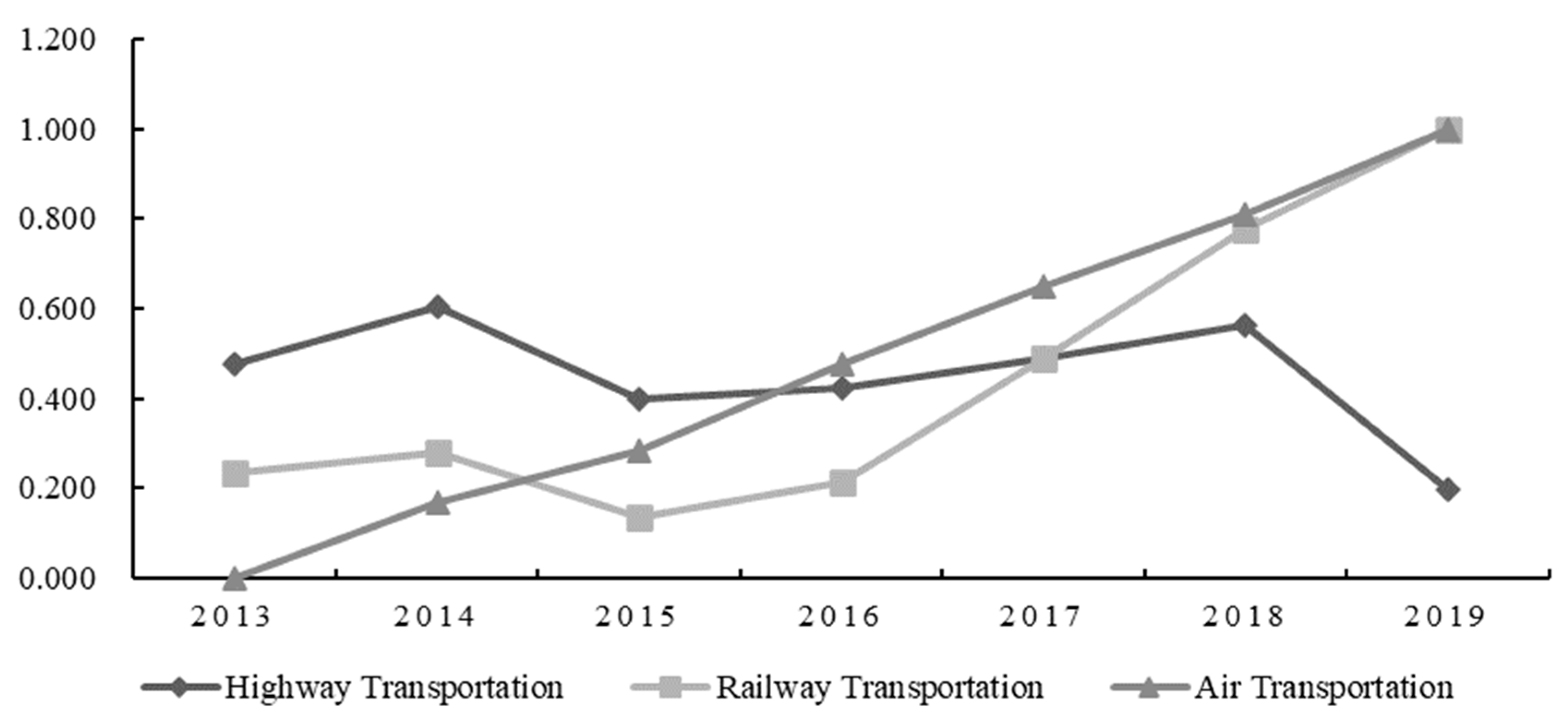 - Adjusting and optimizing the transportation structure to promote the transformation and upgrading of industries in the Yellow River Basin. Our data analysis suggests that the transportation structure in the Yellow River Basin is evolving towards a more sustainable and efficient model, which is linked to the region’s industrial framework. The country needs to continue the strategic adjustment of the transportation structure, leveraging the comparative advantages of various transportation modes. It is necessary to leverage the backbone role of railway transportation, promote the transfer of bulk cargo transportation to railways, promote the transformation and upgrading of highway transportation, and achieve the conversion of old and new kinetic energy. Additionally, orderly growth of air transportation should be maintained, utilizing the technological and service advantages of air transportation to promote the rise of emerging industries in the Yellow River Basin, leveraging the role of aerotropolis in driving local and regional economic growth. Overall, the goal is to enhance the integration and connection of different transportation modes within the Yellow River Basin, thereby improving the overall efficiency of comprehensive transportation. This improvement aims to support industrial innovation through a green, intensive, and efficient transportation structure.
