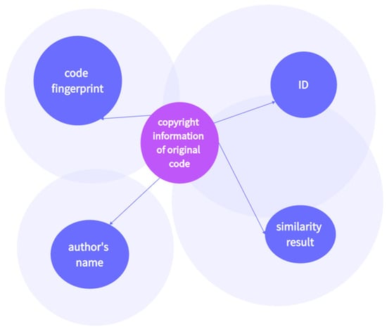 A blockchain-based code copyright management system consists of full nodes and lightweight nodes. Each author or miner can choose the node type. First, the authors submit the code and set the transaction fee. After the eigenvalues of the code files are generated, the full nodes broadcast the code copyright information to the miners. The miners can then verify the originality of the code files by calculating the similarity between the target code and the chained code files (see Figure 1). A code for which the similarity with all the chained code files is lower than the predefined similarity threshold can be marked as an original code file. The copyright information of the original code includes the code fingerprint, ID, similarity result and the author’s name (see Figure 2). Moreover, all this information is recorded in a block and linked to the blockchain. After the block is verified, the miners can receive rewards. Therefore, the system supports the permanent storage and protection of the original source code files. In addition, the data stored on the blockchain can be queried by all the nodes in the proposed system [3].